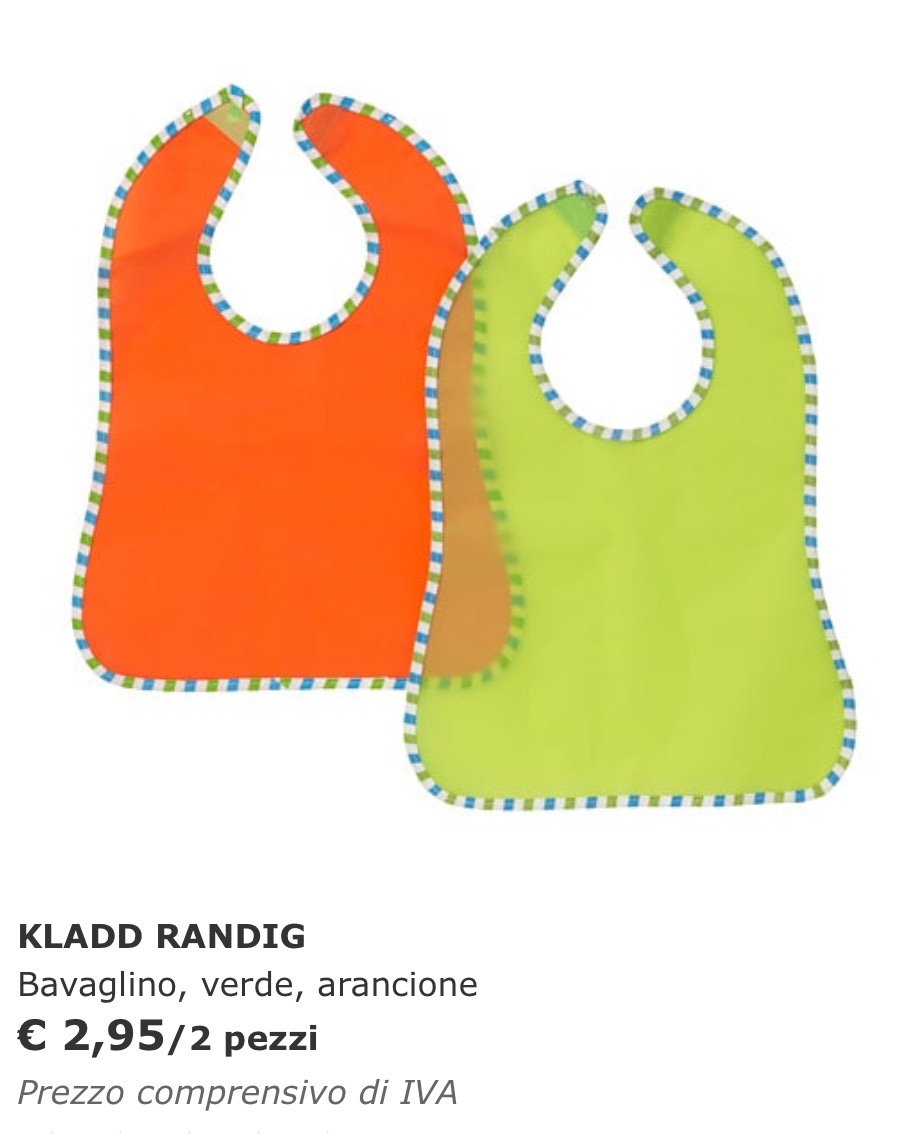 Comodissime anche in giro sono da acquistare sin dall’inizio dello svezzamento a mio parere, perche’ la frutta macchia tantissimo e rovina davvero i capi che purtroppo spesso non tornano piu’ puliti neanche dopo il candeggio. Parola di casalinga disperata! Sono vendute a coppie in arancio e verde.
