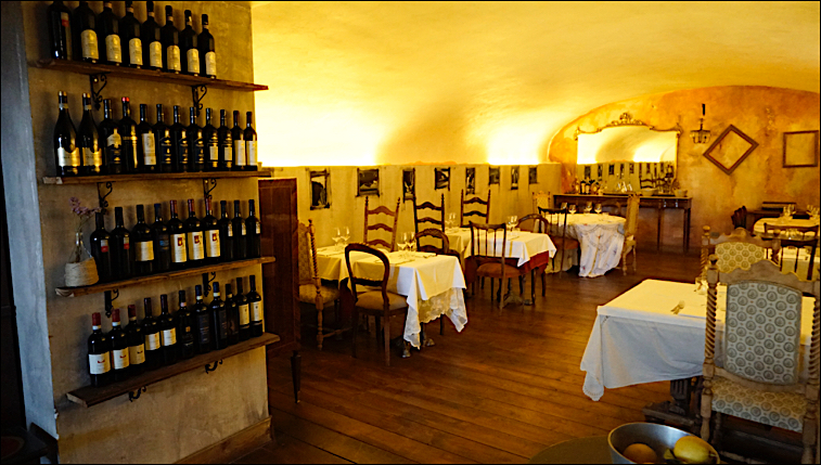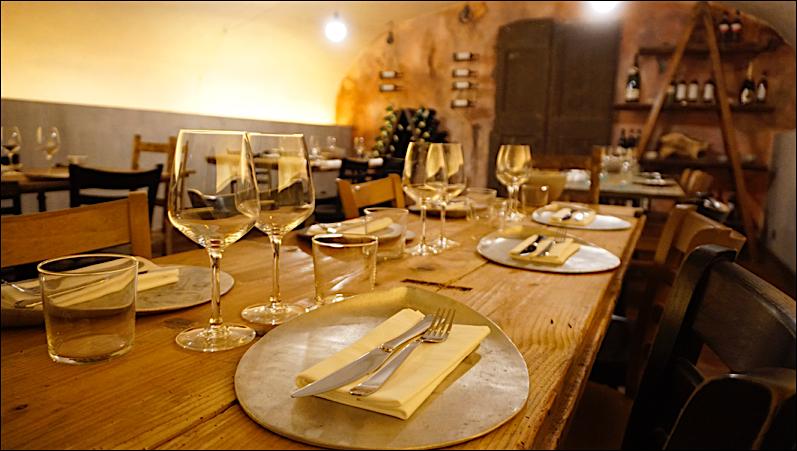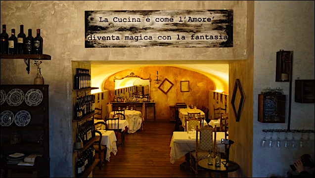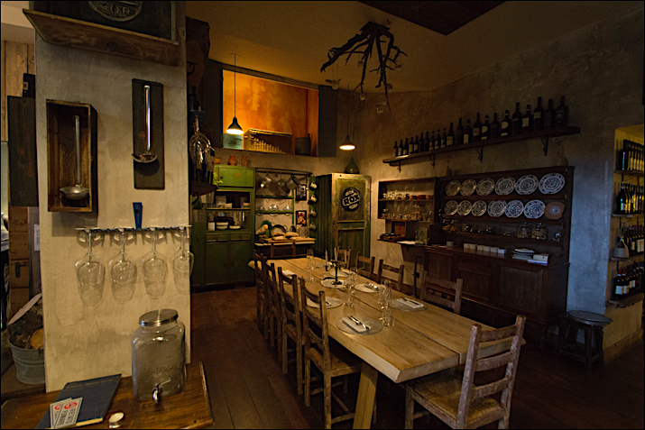 Legno, terracotta, grigi e rosso romano anche nella seconda sala: una cucina di una casa colonica, con un tavolo da 10 posti attorniato da tanto di madia, credenza e piattaia colme di attrezzi, vasetti di marmellata, dolci e salumi della Marsica, del Chietino e del Teramano. E poi la sala da pranzo vera e propria, con una grande specchiera, una vecchia radio come si usava una volta, un tavolo in marmo e altri tavolini più piccoli che ospitano 35 avventori. Infine la “cantina”, una saletta con 4 tavoli sociali realizzati da vecchie porte contadine, tra botti, vini appesi e rami che escono dai soffitti. Tutto è a volte, come usava essere a Testaccio nei locali dove si produceva del vino, essendo questo l’effettivo uso fino a fine ‘800 della location che ospita la Locanda Abruzzese.