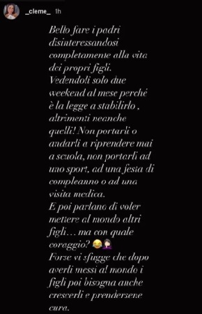 E ancora: “Non portarli o andare a riprendere mai a scuola, non portarli ad uno sport, ad una festa di compleanno o ad una visita medica. E poi parlano di voler mettere al mondo altri figli: ma con quale coraggio? Forse vi sfugge che dopo averli messi al mondo i figli poi bisogna anche crescerli e prendersene cura”.