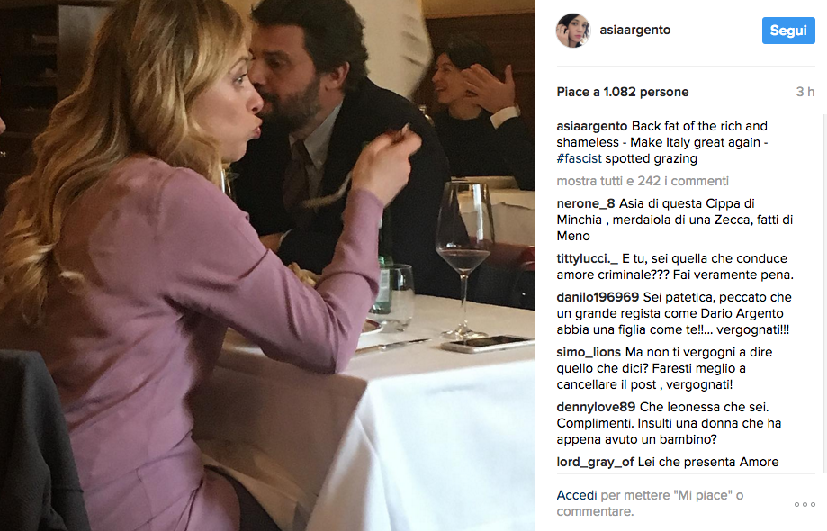 Lite social per Giorgia Meloni ed Asia Argento. La popolare figlia d’arte, attraverso il suo profilo instagram, si è, infatti, scagliata senza mezzi termini contro Giorgia Meloni, da lei stessa pizzicata in pausa pranzo in un ristorante della capitale.