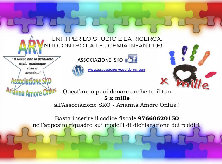 L’Associazione SKO non si arrende e porterà avanti concretamente questa lotta. Lotta alla quale da oggi è possibile partecipare. Da quest’anno è infatti possibile donare il tuo 5 x Mille all’associazione SKO Arianna Amore Onlus, farlo è semplicissimo: basta inserire il codice fiscale 97660620150 nell’apposito riquadro sui modelli di dichiarazione dei redditi, donando, così, non solo un essenziale contributo, ma, innanzitutto, un sorriso. “Uniti si Vince”. Maggiori info sul sito www.associazionesko.wordpress.com