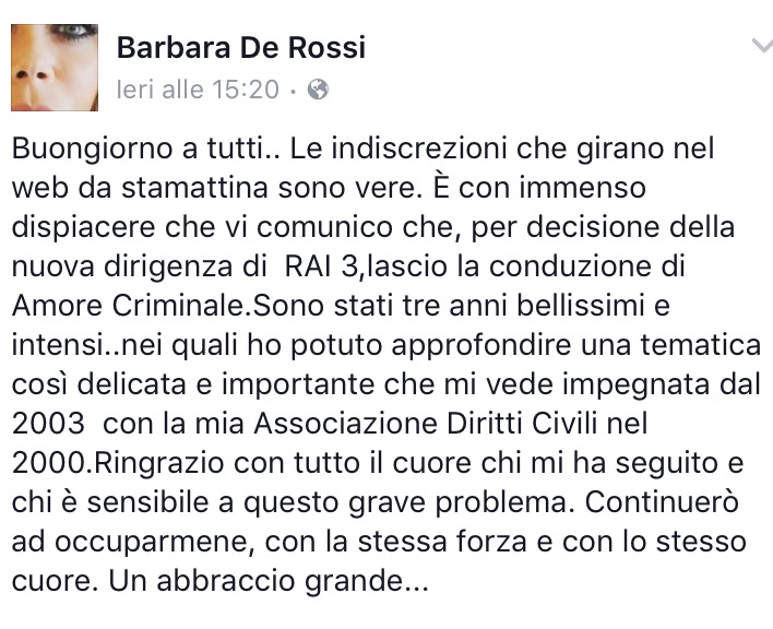 Su Asia Argento poi, ammette le sue perplessità: “Se mi avessero sostituito con la Morante o la Guerritore avrei capito di più. Ci vuole delicatezza e attenzione nel decidere a chi affidare un programma che affronta tematiche così difficili. Condurre questo programma vuol dire prendere le donne per mano, incoraggiarle a denunciare quando serve, rassicurarle sul fatto che si può essere aiutate. Che le donne oggi non sono sole”. Ovviamente, Barbara non si è fatta mancare uno sfogo anche dalla sua pagina Facebook, ottenendo, come è giusto che sia, il consenso dei follower.