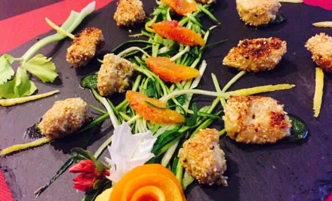 Infarinare i bocconcini, immergerli in una bacinella d’acqua, passarli dentro i semi di sesamo e coprirli bene. In una padella far soffriggere i bocconcini per 7/8 minuti a fiamma bassa, rigirandoli spesso. Dovranno risultare ben dorati.