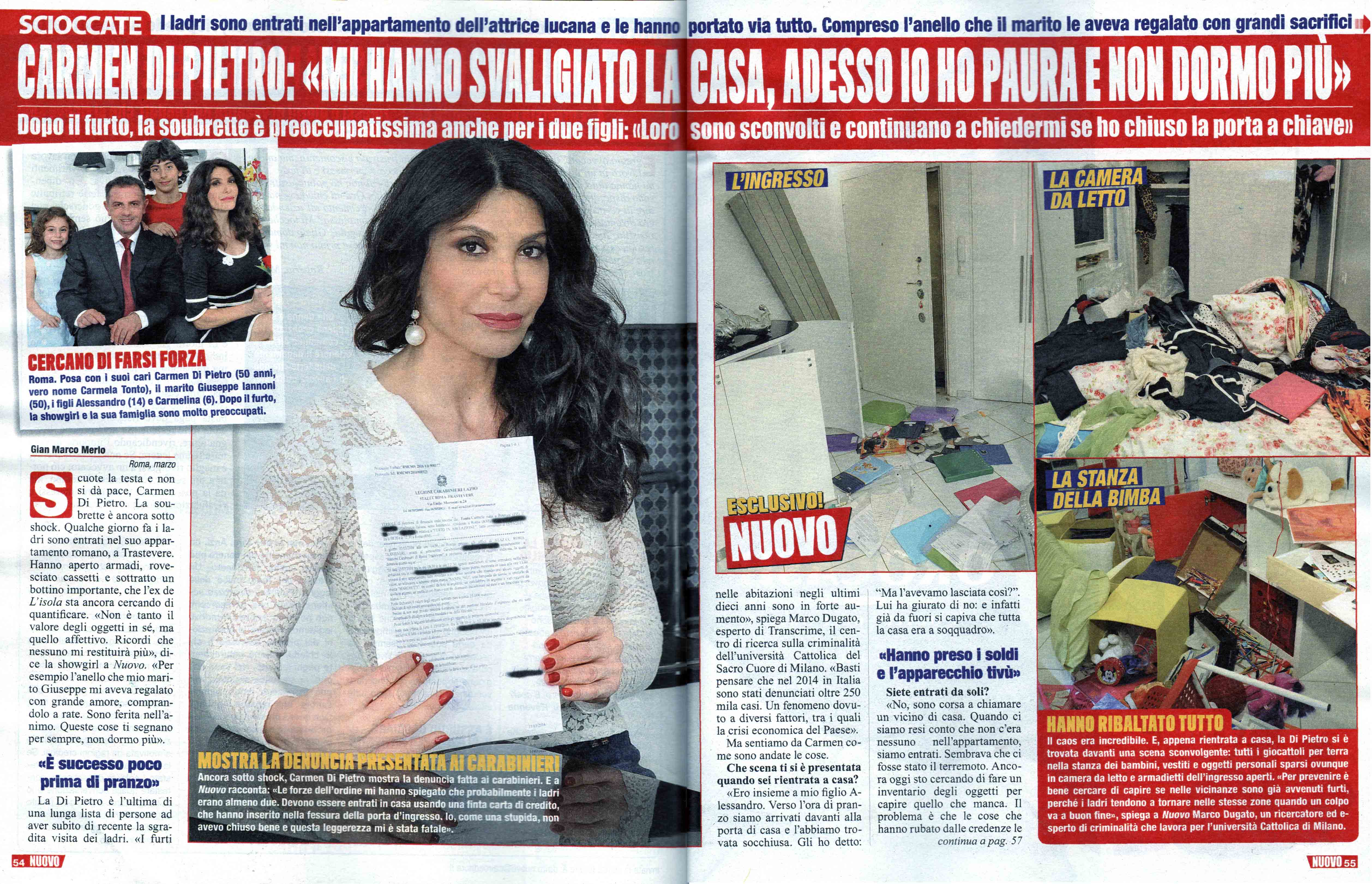 Brutto trascorso per Carmen Di Pietro, la popolare show girl di origini salernitane è stata derubata nel suo appartamento di Roma, dove vive con il marito Giuseppe Iannoni e i figli Alessandro e Carmelina. In una recente intervista per il settimanale Nuovo, Carmen racconta tutto il suo sgomento per l’accaduto: “Qualche giorno fa i ladri sono entrati in casa, hanno aperto armadi, rovesciato cassetti e sottratto un bottino importante, è stato terribile!”.