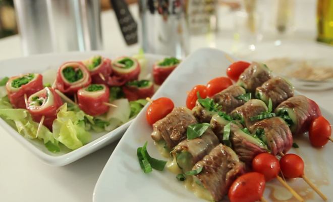 A questo punto iniziate ad avvolgere il carpaccio tenendo la parte terminale a parte in modo da poter chiudere al meglio il cilindro che si verrà a formare. Infilate gli stecchini da un lato, tenendo la distanza tra i cilindri di circa un dito, in modo da rendere più agevole il taglio.