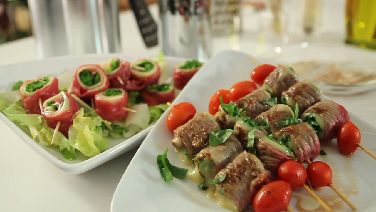 Per la parte cotta invece, scaldate la teglia con un po’ di olio evo e andate a scottare ( non cucinare) gli spiedini per circa 3 minuti a fuoco medio. Le due proposte per il carpaccio sono completate, non vi resta che impiattare e portare il vostro piatto a tavola.