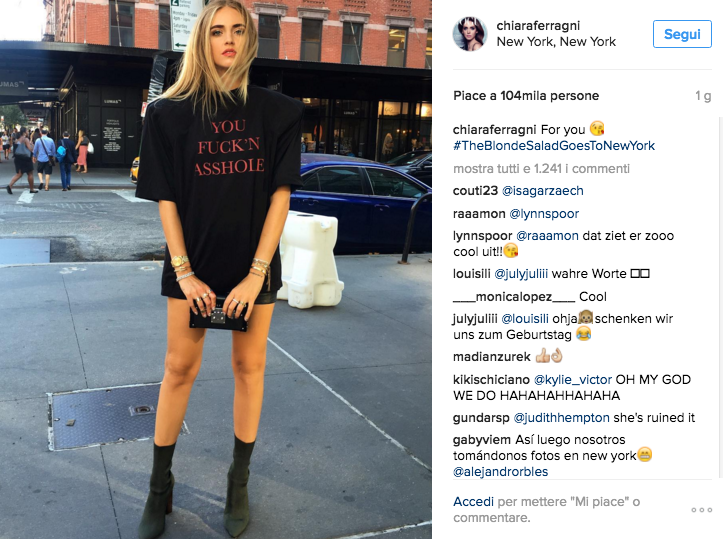 Solo pochi giorni fa vi abbiamo parlato di Chiara Ferragni, la blogger da milioni di contatti, pizzicata a cena con il rapper Fedez, ed ora torniamo a parlare di lei, a causa di uno strano messaggio apparso su una t-shirt della blogger il giorno dopo la pubblicazione delle foto in compagnia del cantante. “Sei uno stronzo” recita la maglietta indossata in occasione della New York fashion Week, il tutto accompagnato da un messaggio postato dalla stessa Chiara: “per te :*“.