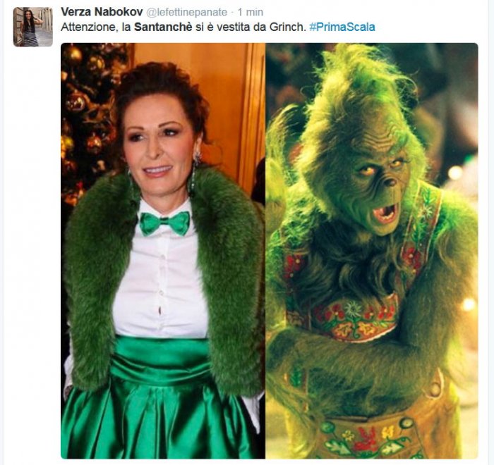 Una camicia bianca, un papillon, una gonna ed un pellicciotto verdi sono bastati a scatenare l’ironia dei social network, che, senza mezzi termini, da ore massacra la deputata. Un Arbre Magique, il Grinch, un dinosauro o addirittura un albero di Natale, questi solo alcuni dei riferimento al suo abito che, tra i tanti contestatori ha anche trovato chi, ironicamente, difende la donna spiegando che deve aver sicuramente confuso “Verdi” (nome dell’autore dell’opera Giovanna D’Arco andata in onda alla Scala) per il tema della serata.
