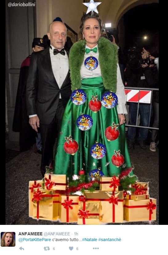 Qui di seguito una raccolta di tweet e fotomontaggi sull’accaduto: “Rivendicato dall’ISIS l’abito della Santanchè” dicono, “Rubare la Santanchè e posizionarla in sala per risolvere il problema dell’abito di Natale” ribatte qualcuno, “All’arrivo della Santanchè i metal detector hanno iniziato a suonare ancor prima che attraversasse la strada” conclude qualcun altro, fino ad arrivare alle simpatiche vignette e fotomontaggi che stanno facendo il giro della rete.