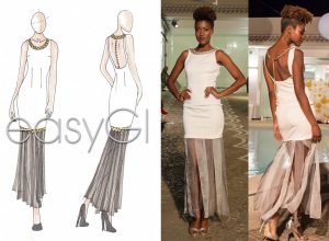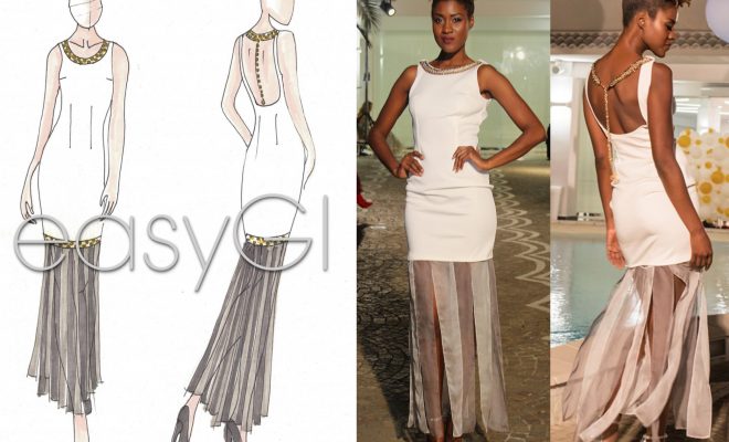 Qui di seguito i bozzetti e gli abiti visti in passerella. Il bianco e nero si alternano ad accessori vitaminici, spiccano il rosso, il verde, il giallo e l’arancione, creando così un gioco di contrasti pensati per una donna che ama la semplicità ma non vuole passare inosservata.
