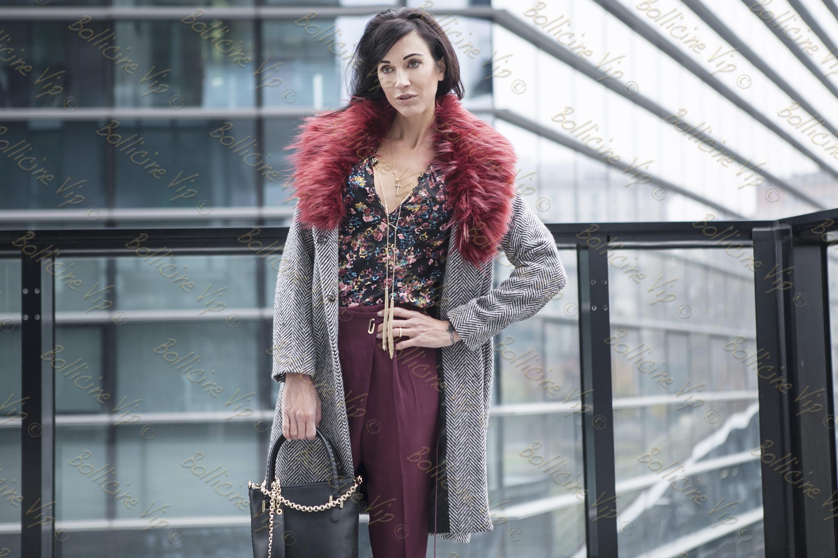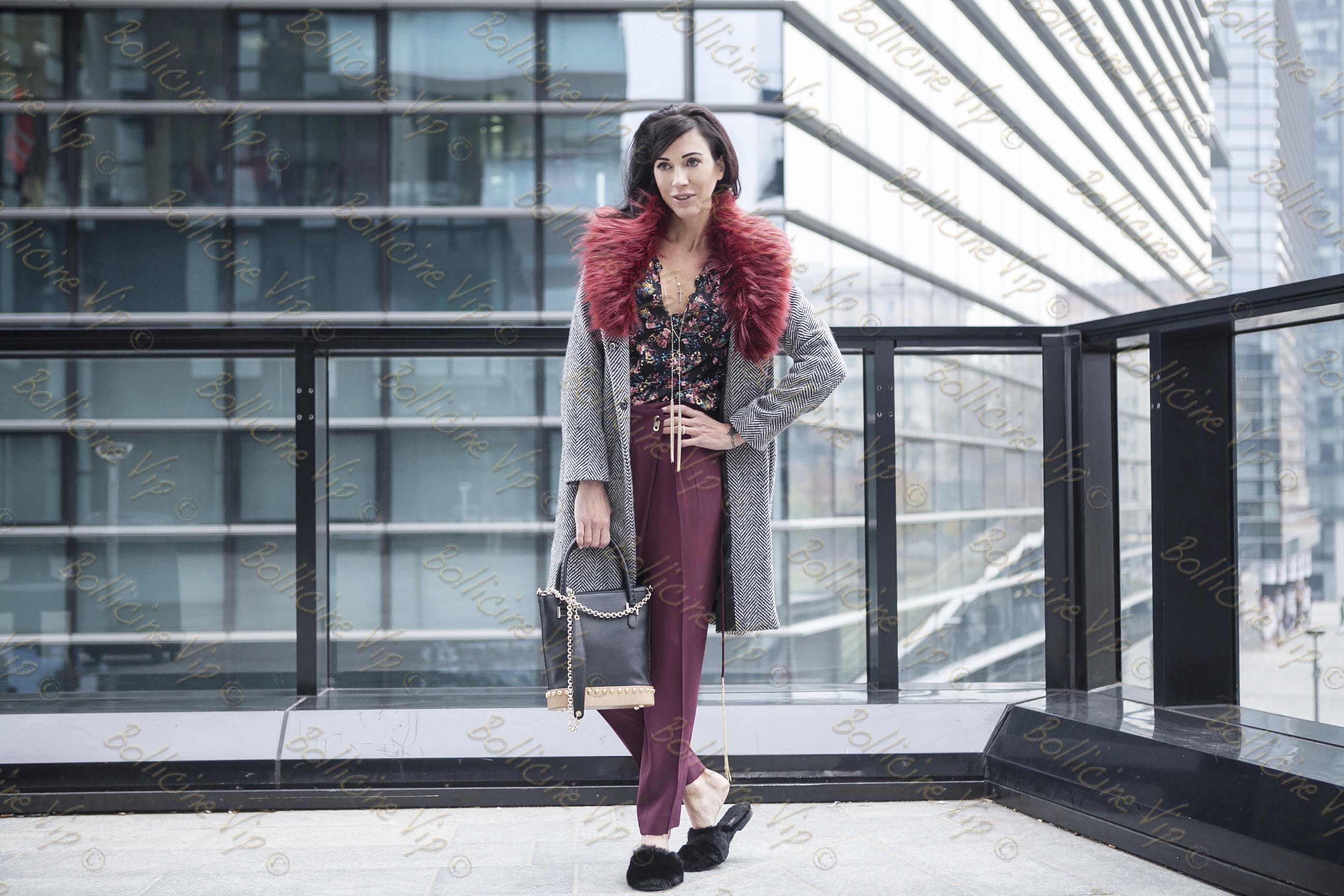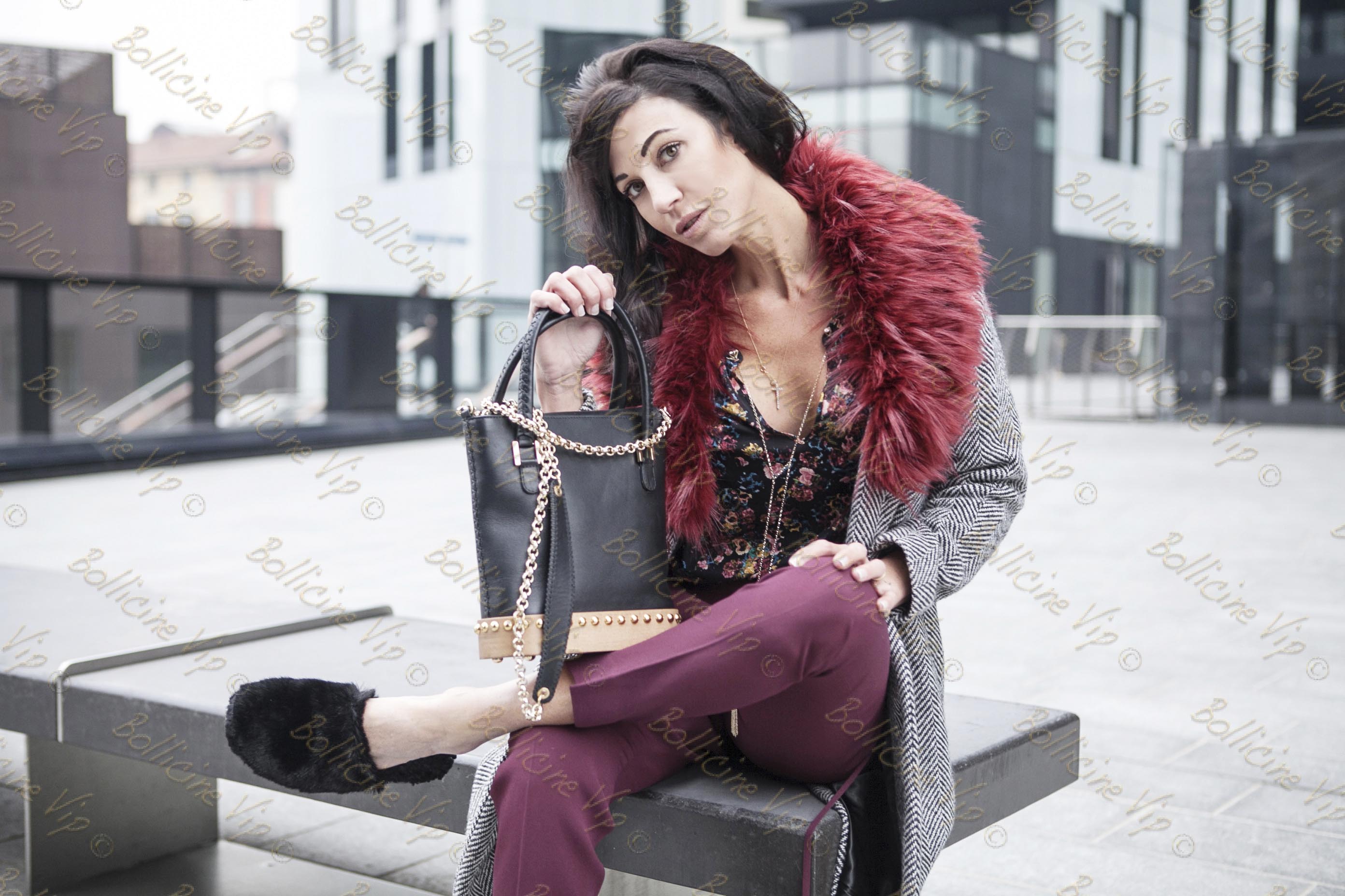 ph Cinzia Mele Cappotto classico con dettaglio ecofur Italogy , pantaloni e camicia Via delle Perle, borsa Laura Fed e slippers in pelliccia Avec Moderation