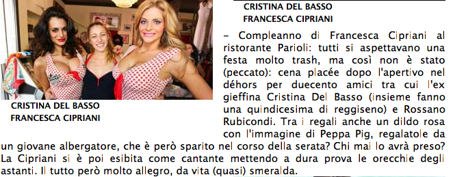 Sono stufa, stufa di tutte queste menzogne. So che stare al gioco fa parte del mio mestiere e non me ne sono mai lamentata, ma questa volta si è superato il limite. Dopo la mia festa di compleanno (lo scorso 6 luglio al Parioli di Milano) Dagospia ha scritto che avrei ricevuto un “porno regalo”: un dildo rosa dalle sembianze di Peppa Pig, ma non è assolutamente vero. Indagheremo su ciò e partiranno le dovute denunce.