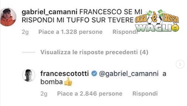 Pochi giorni fa Francesco Totti ha postato una foto sul suo profilo Instagram insieme ad alcuni suoi amici, come sempre tantissimi sono stati i commenti postati dai suoi fan, tra questi anche Gabriele ha commentato lo scatto. Queste le sue parole: “Francesco se mi rispondi mi butto sur Tevere.”