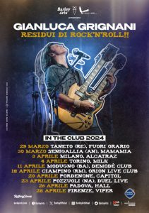 Gianluca Grignani torna dal vivo con Residui Di Rock’n’roll, il nuovo tour che a partire dal 29 marzo lo porterà live nei principali club italiani.Dieci speciali appuntamenti in location che accentuano il carisma di Grignani e che sono state scelte per permettere al pubblico di riunirsi, grazie alla musica, in un imperdibile incontro con il cantautore eclettico ed elettrico.