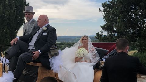 Quello di Simone e Gaia è stato un matrimonio molto romantico, la sposa è arrivata su una carrozza trainata da due bellissimi cavalli bianchi. Alle nozze erano presenti circa 200 invitati, ma quasi tutti hanno atteso l’uscita degli sposi fuori dalla chiesa perché non c’era spazio per tutti.