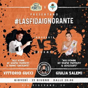 Questa volta la ripartenza al “il panino ignorante gourmet” si fa dolce grazie alle collaborazione con Steccolecco, uno dei più buoni gelati presenti sul mercato. Il 25 giugno a Via Vigevano ripartono le grandi sfide. Nella prima puntata a sfidare Vittorio Gucci ci sarà Giulia Salemi, la showgirl autrice del libro “Agli uomini ho sempre preferito il cioccolato”. Un libro dove l’autrice si racconta a tutto tondo e senza filtri. Una storia, quella di Giulia, caratterizzata da tante sfide e fallimenti, ma anche di grandi gioie e soddisfazioni.