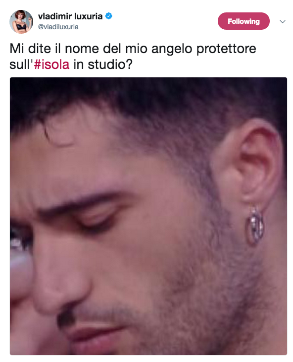 “Ho visto un angelo ma non era sull’#isola era in studio… Inquadrato tra il pubblico, moro e bono! Chi è??? Voglio farmi proteggere da lui!” ha twittato la donna, ed ancora: “Mi dite il nome del mio angelo protettore sull’#isola in studio?” allegando al tweet la foto del ragazzo.