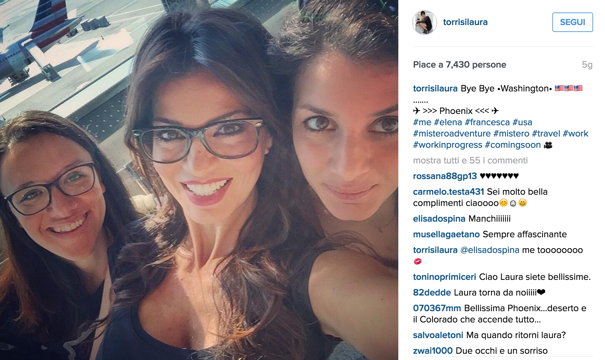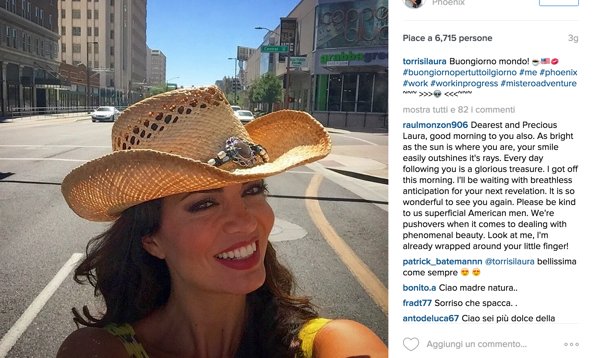 Poi è arrivato un selfie dall’aeroporto seguito dal  commentato: “Bye Bye Washington. Phoenix #me #elena #francesca #usa #misteroadventure”. E poi ancora sono state postate altre immagini: una ritrae la bellissima Laura con in testa un cappello da cowgirl nel deserto e un’altra, con lo stesso copricapo, a Phoenix. “Buongiorno mondo! #buongiornopertuttoilgiorno #me #phoenix #work #workinprogress #misteroadventure”.