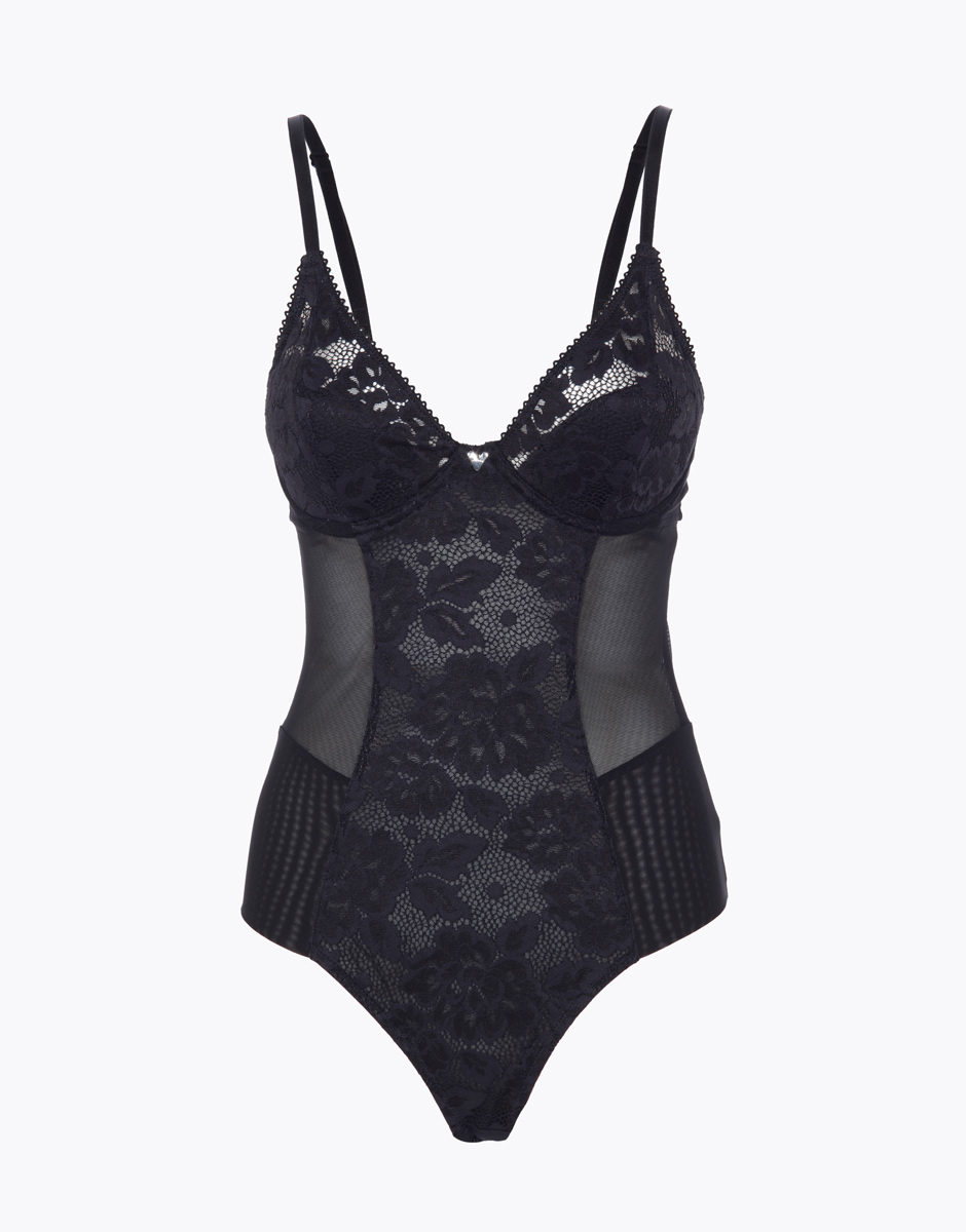 – il Body dall’ispirazione vintage per un look impeccabile! Pannello frontale in pizzo riciclato doppiato in tulle per offrire massima invisibilità anche sotto i vestiti più attillati, elastico girovita extra comfort, dettagli in tulle su retro e fianchi e scollo con elegante finitura picot. Il body rappresenta il perfetto complice di vestibilità sotto qualsiasi abito o indossato a vista sotto giacche dal taglio maschile.