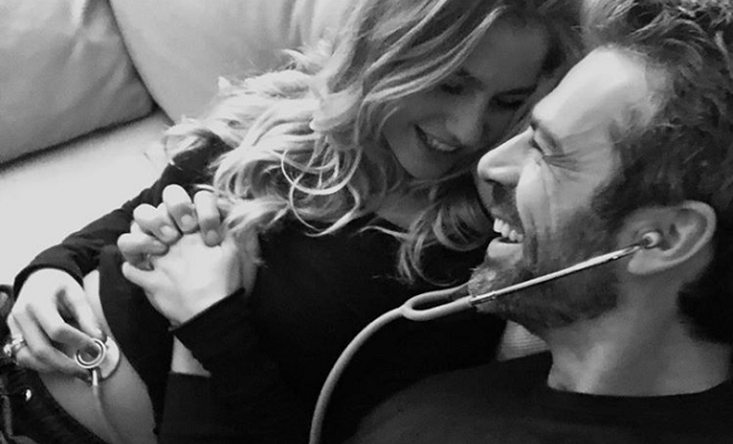 Su Instagram hanno postato una foto dove si tengono per mano seduti sul divano e sorridono, l’attore cerca di ascoltare il figlio con uno stetoscopio poggiato sulla pancia della compagna. Nella didascalia dello scatto hanno scritto: “Io e te… Diventiamo tre”.