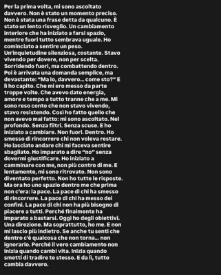 E ancora: “Ho smesso di rincorrere chi non voleva restare. Ho lasciato andare chi mi faceva sentire sbagliato. Ho imparato a dire “no” senza dovermi giustificare. Ho iniziato a camminare con me, non più contro di me. E lentamente, mi sono ritrovato. Non sono diventato perfetto, non ho tutte le risposte ma ora ho uno spazio dentro me che prima non c’era: la pace. La pace di chi ha smesso di rincorrere. La pace di chi ha messo dei confini. La pace di chi non ha più bisogno di piacere a tutti. Perché finalmente ha imparato a bastarsi”.