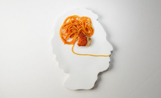 Ecco allora che Franco Aliberti mette in scena una composizione in cui, dalla bocca, parte un filamento dello spaghetto che conduce a un cervello fatto di spaghetti al pomodoro. Proprio questo piatto simbolico della nostra alimentazione ha il potere di evocare ricordi personali in ognuno di noi radicati fin nell’infanzia. In corrispondenza dell’amigdala, l’archivio della nostra memoria emozionale, nel piatto lo chef ha posto un pezzetto di pane al pomodoro per simulare la scarpetta che facevamo da piccoli. Fin dal primo assaggio, Il cibo non mente sprigiona tutta la sua traccia di gusti primari genuini.