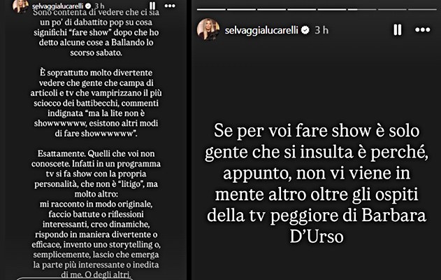 Questo è ciò che si legge nelle storie: “Sono contenta di vedere che ci sia un po’ di dibattito pop su cosa significhi “fare show” dopo che ho detto alcune cose a Ballando lo scorso sabato. È soprattutto molto divertente vedere che gente che campa di articoli e tv che vampirizzano il più sciocco dei battibecchi, commenti indignata “ma la lite non è showwwwww, esistono altri modi di fare showwwwww”.