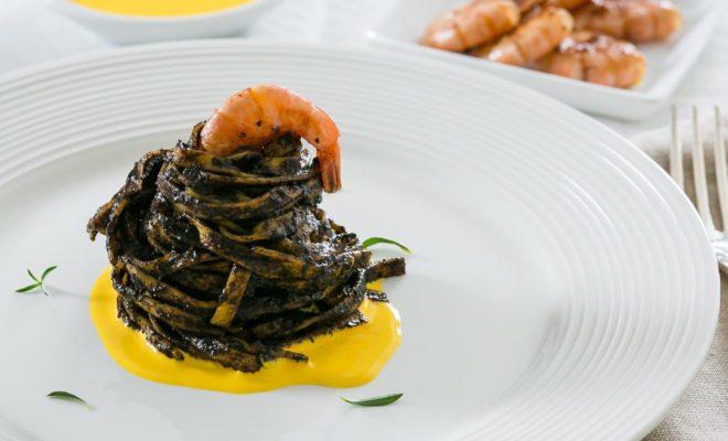 TAGLIOLINI AL NERO DI SEPPIA CON GAMBERI