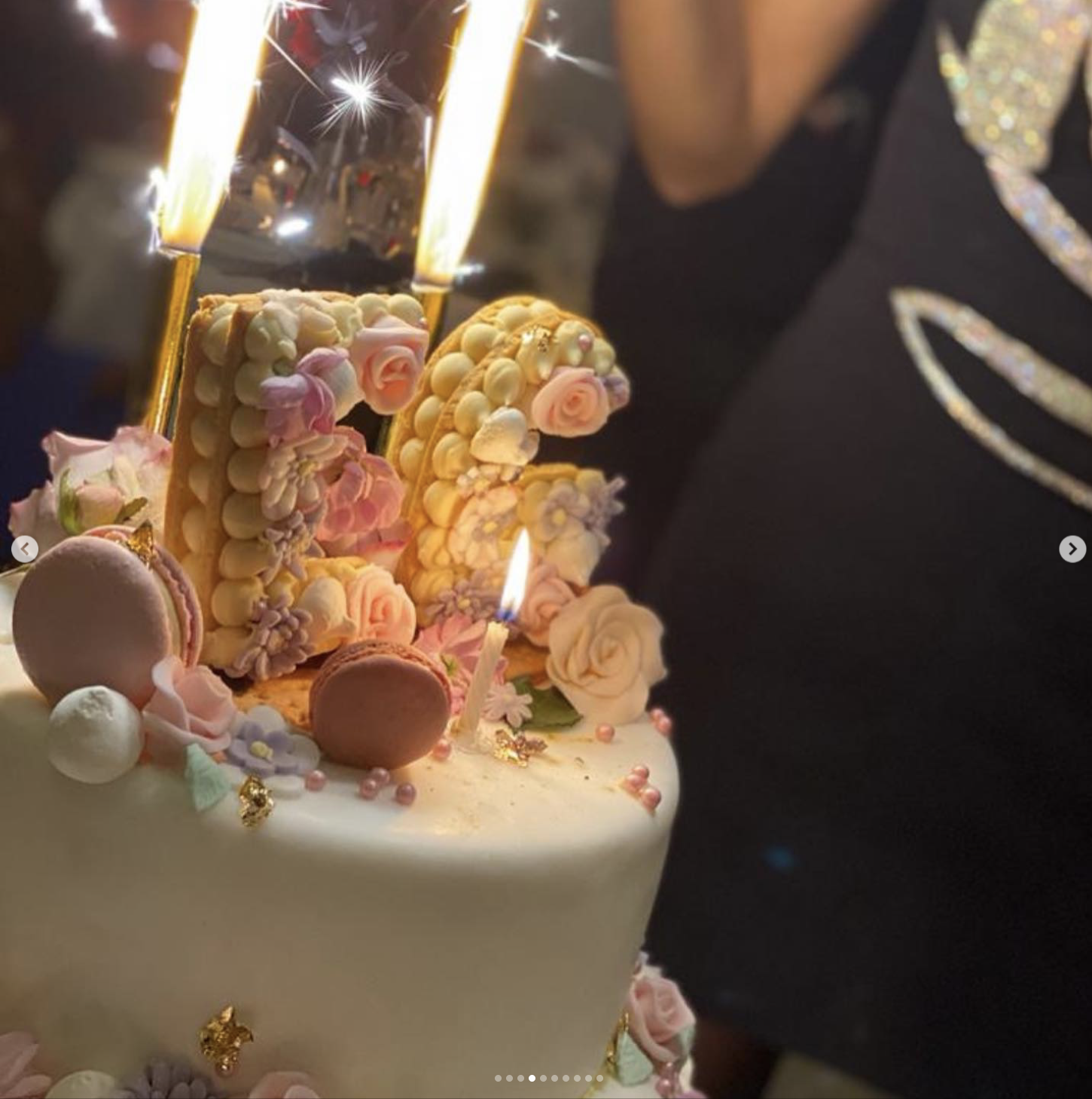 Infine non poteva mancare la torta. A tre piani. Tempestata di macarons e fiori. Con due enormi candeline a forma di “E” e “G”. Tutto sui toni del bianco e rosa.