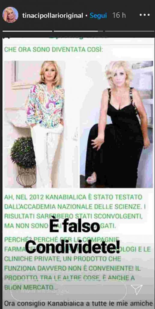 Durante la diretta Instagram Tina Cipollari ha dato sfogo a tutta la sua rabbia dopo aver scoperto che un post pubblicitario ha utilizzato la sua immagine per sponsorizzare dei prodotti dimagranti. L’opinionista ha subito provveduto ad avvisare tutti i suoi fan scrivendo il seguente avviso:”È UNA NOTIZIA FALSA! HANNO USATO LA MIA IMMAGINE, NON SO DI COSA SI TRATTA MA SARANNO DENUNCIATI!“. Tina non si è dunque solo limitata ad inveire contro il marchio di prodotti dimagranti, ma anzi è passata alle minacce. Stando a quanto ha scritto la stessa Cipollari su Instagram, l’opinionista di Uomini e Donne ha intenzione di presentare denuncia contro il fantomatico brand di prodotti per la silhouette.
