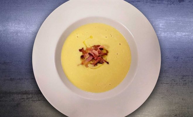 VELLUTATA DI PATATE E PERE CON GORGONZOLA E SPECK CROCCANTE